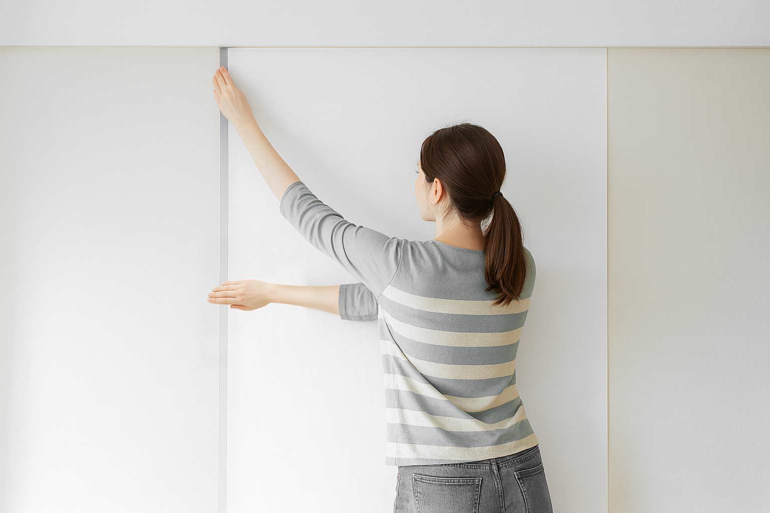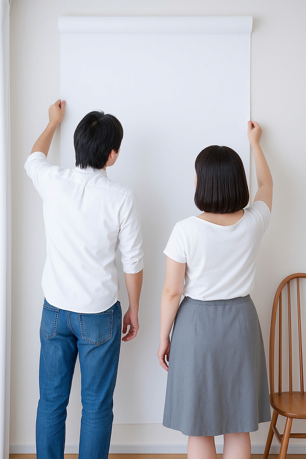 A. 1m × 1.5m 크기라 혼자서도 충분히 부담없이 붙일 수 있지만, 벽면 전체를 커버할 땐 2인이 함께 붙이면 더 편합니다.